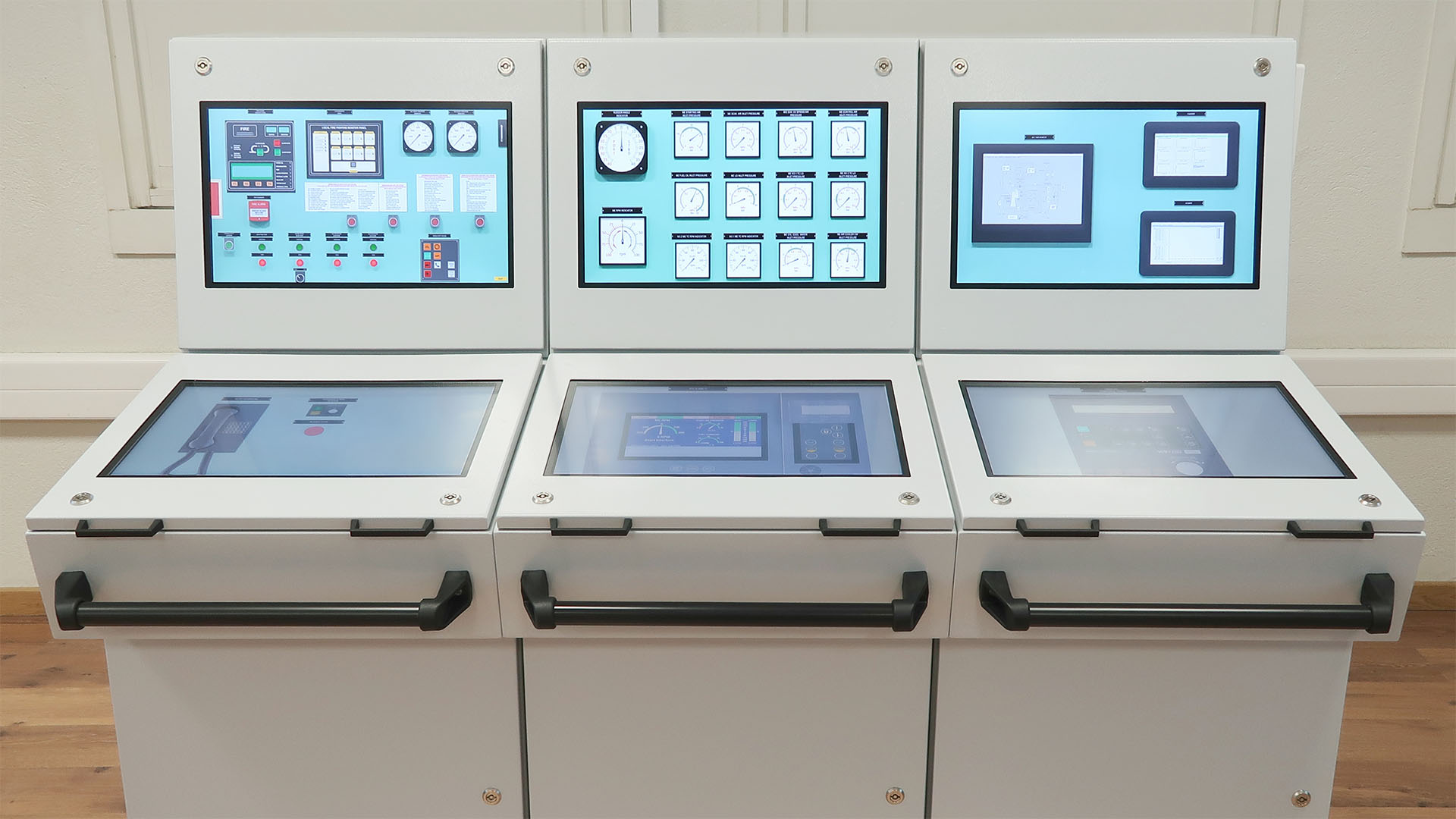 - Hardware console with 6 touchscreen monitors (22″) for engine control room visualization;